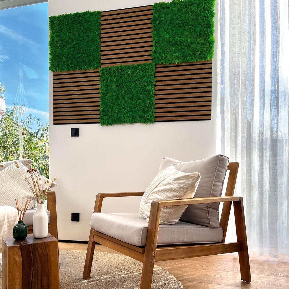 Žiarivé odtiene zelenej, špeciálny povrch a upokojujúci vzhľad – naše panely sú ideálnym riešením na vytvorenie jedinečnej machovej steny a tým aj krásnej a pokojnej klímy v miestnosti.